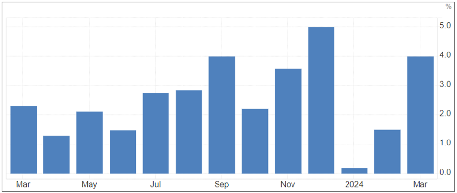 代表美国消费动力与经济情况的零售销售数据同样表现不俗,月增率0.7%,高于经济学家预期的0.3%;换算成年率来到4%,一扫年初仅0.2%的窘境,然而却也无形中加大了市场对于通胀挥之不去的阴影。
