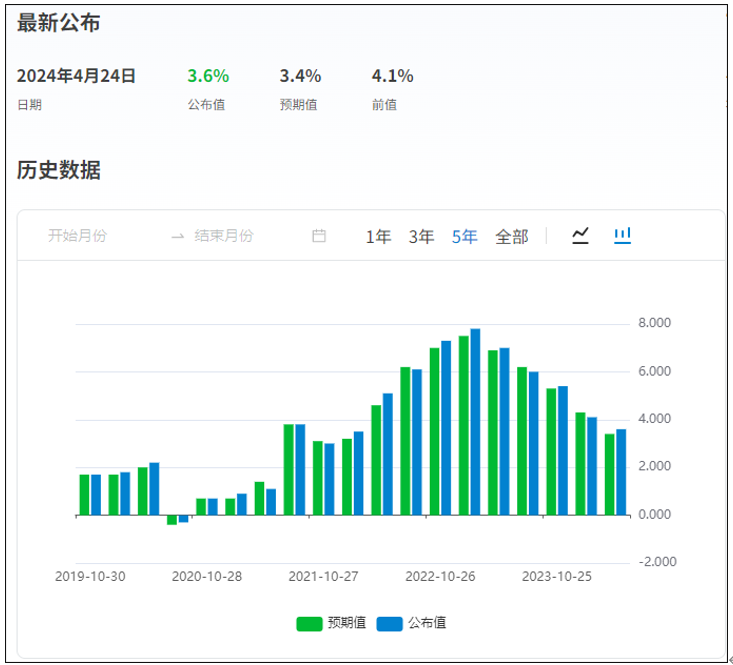 刚刚我们谈到美元在4月10号出现大幅上涨,其中背后的主要原因在于美国CPI通胀数据的公布,广义CPI年率公布为3.5%,大于市场预期的3.4%,也高于前值的3.2%,核心CPI(不包含食物、能源项目)年率为3.8%,虽与前值持平,但同样高于市场预期的3.7%。