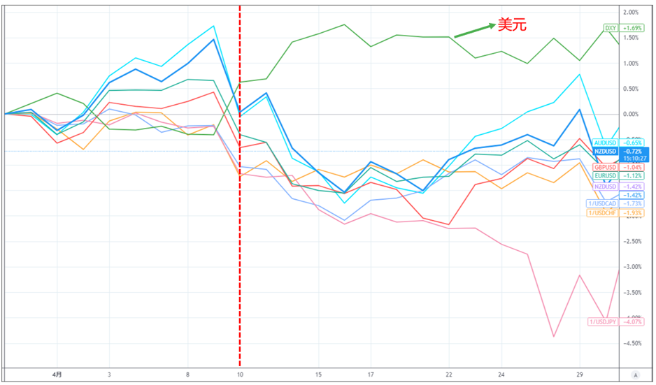 从过去一个月各主要币别的汇率走势图可以发现,美元在4月10号奠定了一整个月上涨的基础,其余非美货币则从那时开始积弱不振,其中日元跌幅在4月下旬更出现加速下跌,创了过去一年来的最大月度跌幅。
