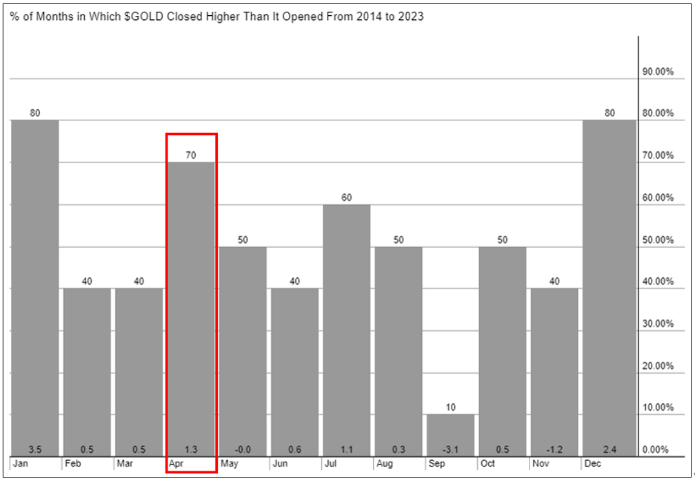 虽然黄金在2月及3月已经连续两个月上涨,然而若去参考过去10年的每月涨跌时,可以观察到4月份对于黄金来说是表现第三好的月份,上涨概率为7成,平均涨幅为1.1%,若以3月底金价约2,230美元来看,有约25美元的获利空间。