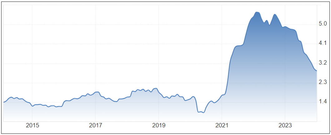 3月8号所公布的2月非农就业数据为新增27.5万人,虽然优于预期的20万,然而却是2023年11月以来的新低,且2023年12月份及2024年1月的数据被反向下修,经调整,这两个月的就业数据和计较修正前减少16.7万人。