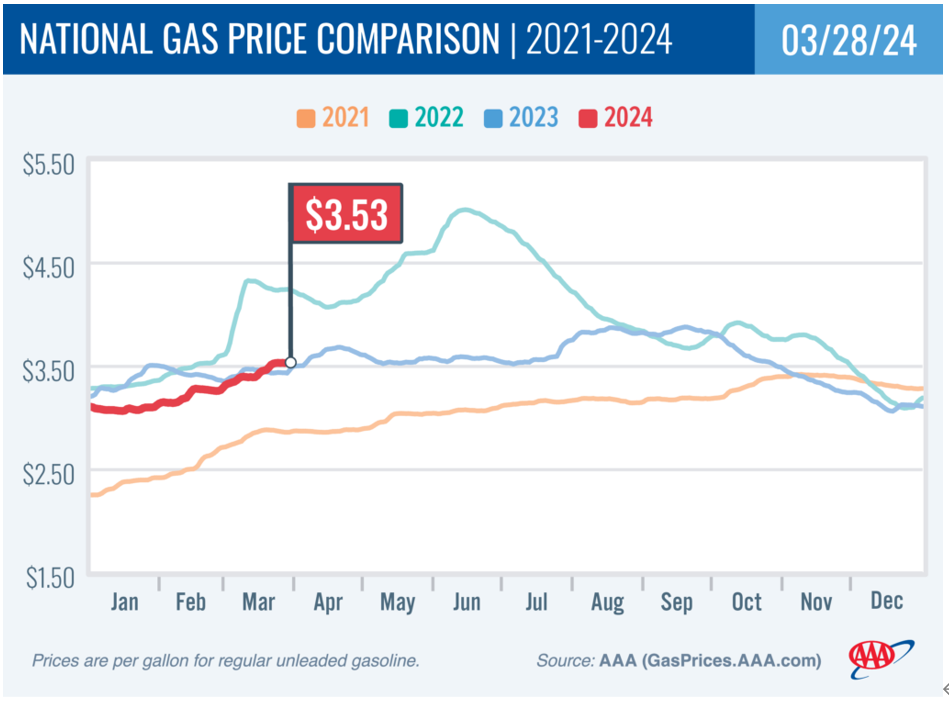 从美国汽车协会(American Automobile Association,简称AAA)所统计的资料显示,汽油价格从今年以来持续上扬,目前已经来到每加仑3.53美元,这是自去年10月以来的最高价,而且跟去年的3月相比(浅蓝色的线代表2023年的价格走势),上扬了10美分,也就是年增2.92%。如此一来尚待公布的3月CPI通胀数字可能继续呈现粘滞。夏季用油旺季也即将到来,汽油继续上升压力可能不小,若影响太多,恐将影响美联储在6月可能降息的决定,可能影响黄金继续上涨的势头。