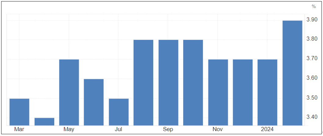 与此同时,失业率来到3.9%,为2022年1月来新高。数据出来后,美元下挫,致使金价续升。