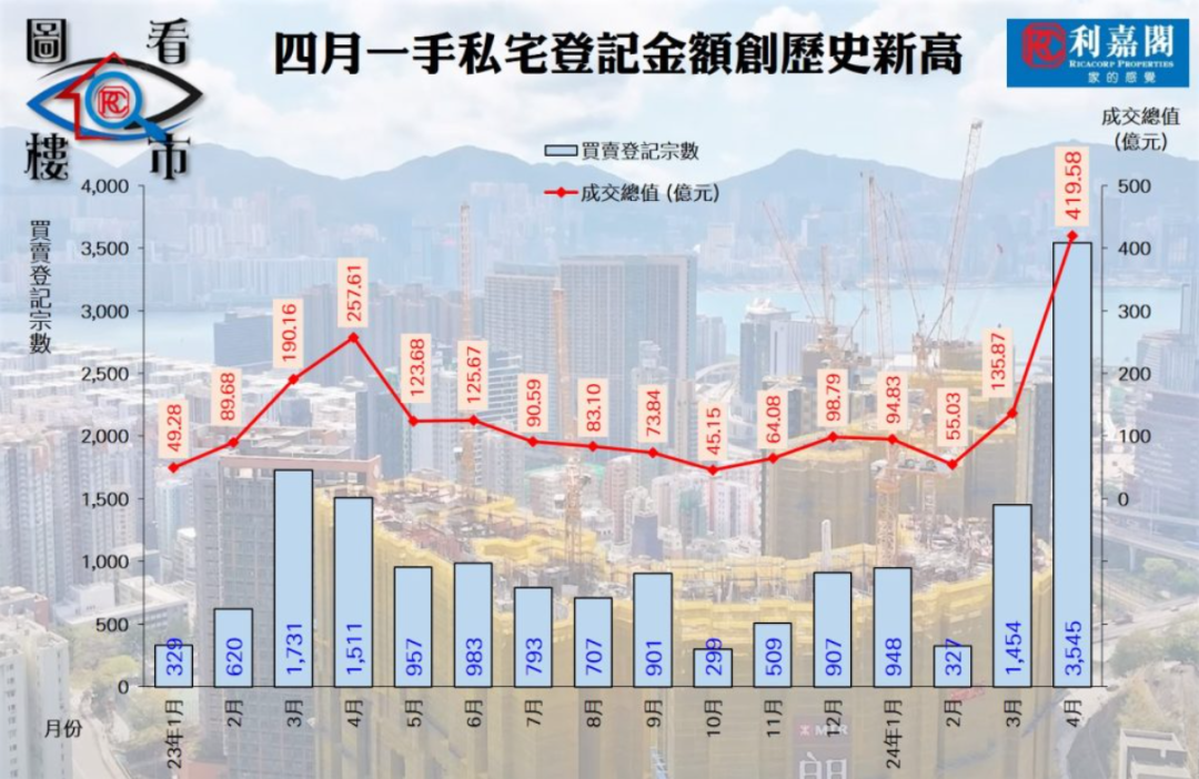 港股的强劲和近期楼市复苏脱不了干系。自从香港“撤辣”后(全面撤销内地买家印花税),内地买家蜂拥而至,令3月和4月香港楼市的需求飙升。根据最新的地产数据,4月份香港的一手住宅销售额飙升至420亿港元,创下28年来新高;成交量超过3500宗,创18年来新高。当然这与春节后的需求爆发也有关系,但即便如此,和前同期相比,成交量与销售额还是涨了近一倍。
