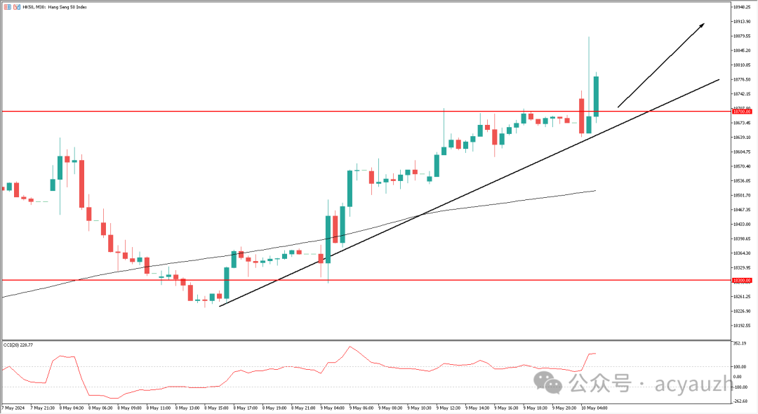 从恒生指数半小时图来看,200均线向上,趋势线提供支撑,价格今早突破了18700的前高阻力线,CCI趋势指标同步突破+100线,看涨动能强劲。交易策略应该以顺势或回踩看涨为主。回踩位置主要看18700关口。短线关注19000整数位大关的阻力,不过中线较强的阻力位置要看20000大关。能否继续突破,需要重点关注月中发布的中国70个城市二手住宅销售报告。