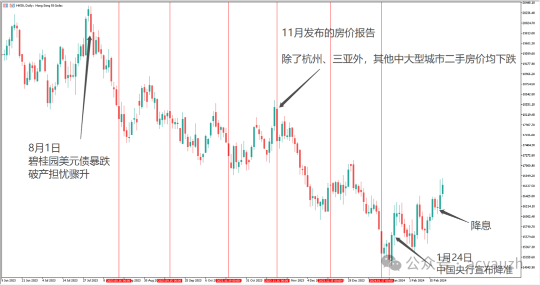 恒生指数,或者说中国相关股市,之所以持续下跌,原因还是出在地产上。继恒大之后,规模最大的房企碧桂园也出了问题。8月1日,碧桂园境外美元债暴跌,随后公司便宣布了违约,引爆了新一轮地产板块大跌,同时拖累了恒生指数。祸不单行,虽然有各种地产政策刺激,但力度并没有足以恢复市场信心。倒是美股的大涨带动恒指反弹。然而从7月份开始,房价报告表现连月下滑,到11月份报告,除了杭州和三亚外,其他六十多个城市就收房价无一上涨,令恒指重启下滑趋势。这一跌就跌到了今年。