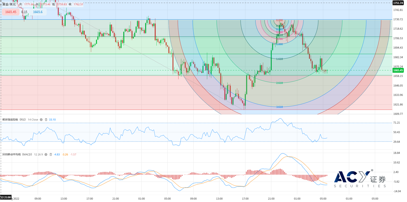 四小时线观察黄金XAUUSD表现,相对强弱指标RSI显示极短线上续跌动能不足,建议投资人虽维持空方操作但需以反弹偏空为主,压力关注1672-1676间,下方仍有望测试1639-1640以及1628两个支撑水平,不过鉴于美联储对于实质利率曲线需整条皆为正数的看法,长线上我们仍认为黄金具有深度向下空间。