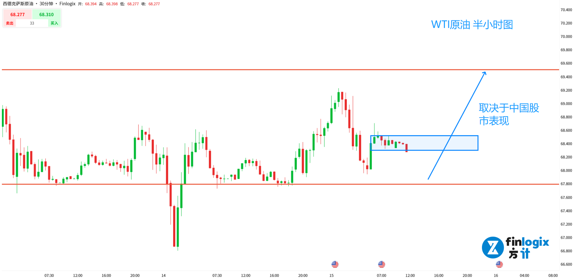 交易策略:(趋势跟随)突破68.5后跟随看涨