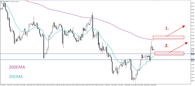 布伦特原油在跌破70美元前止住了跌势,从上周延续到昨天(12月18日)的涨势,短线上出现了双底型态,而且价格也突破了76.5-77.5美元的价格整理静区,不过昨天在挑战200EMA时留下长上引线的止涨型态,短线做多仍须谨慎。