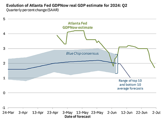 美国将公布第二季GDP成绩单,亚特兰大联储所给的即时预估为1.7%,从2.2%下移。这部份或许受近期的制造业PMI下行所影响。预测值虽有下行,但仍会比第一季的1.4%要来得高。只要接下来就业、个人消费支出的数据能保持稳定,那么美国经济短期仍将表现无虞。