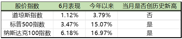 6月美股大盘的表现,依然是相当的亮眼,三大指数全部收涨,而且标普500与纳斯达克100都创了历史新高。若是查看上半年绩效,除了道琼斯因第二季表现较弱而涨幅落后之外,不论是标普500或纳斯达克100都创下了15%以上的涨幅。