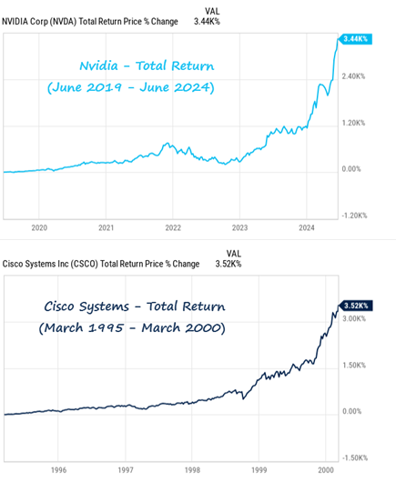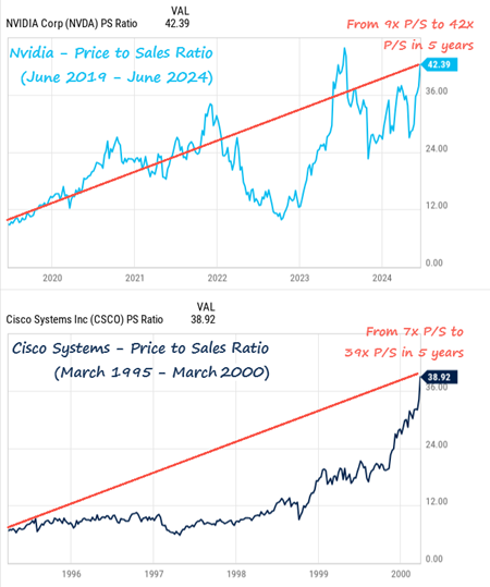 英伟达近期从高点回落,引发不少投资人的注意,担心现在AI的狂热跟2000年的科技泡沫是否有类似之处。我们以跟科技泡沫时期市值最大的思科(Cisco)作比较,首先是涨幅的部份,科技泡沫破裂前5年,思科涨了35.2倍,而英伟达涨了34.4倍;市销比的部份,思科从7倍来到39倍;英伟达则是从9倍来到42倍。