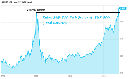 回看從1928年以來的上半年绩效排名,今年标普500指数的优异表现可排到第15名。今年表现最好的类股,仍是以科技及通讯服务类股为主。从下图可以观察到,当前科技板块超越整体市场的表现已超越2000年3月科技泡沫。