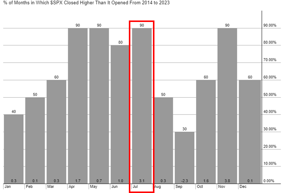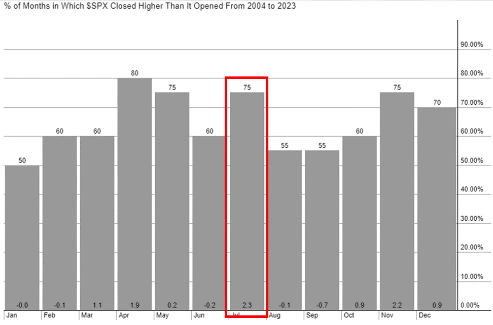 从过去10年以及过去20年在7月份的历史数据来看,7月份的标普500指数上涨概率有7成5到9成,而平均上涨幅度则有2.3%~3.1%,所以长线投资者有机会逢低布局,而短线交易者则可持续偏多操作。