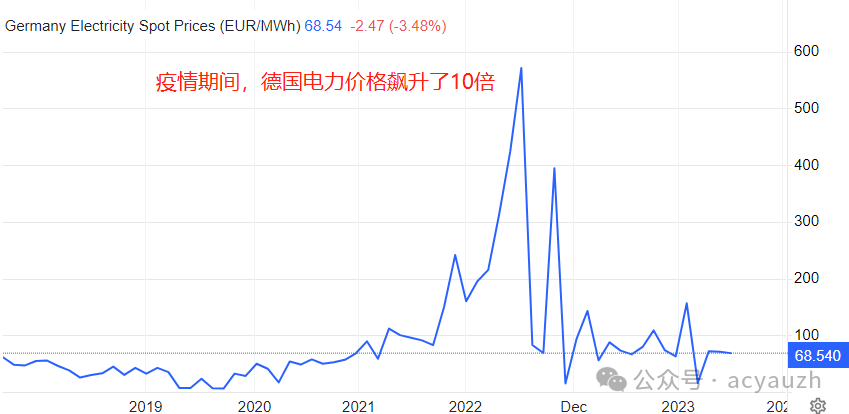 与之截然相反的就是欧元区,由于极度缺乏能源,欧洲的能源危机导致电力价格飙升。以德国为例,在不到两年内,家庭电费飙升了整整10倍!相比之下,瑞士的通胀受欧洲能源危机的影响较少,控制起来自然有也更加容易。