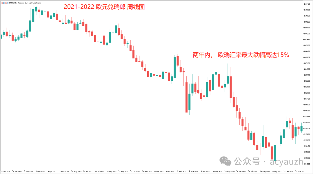 市场对瑞郎的需求也导致瑞士经济出现通缩,然而瑞士央行却无法通过降息去提振经济(外汇不可能三角)。直到瑞士再也忍不了了,主动与欧元的脱钩,同时选择降息。而欧元兑瑞郎的汇率也在一天之内暴跌了14%,盘中曾一度贬值28%。