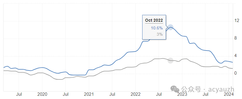 通过对比瑞士和欧元区的通胀变化能够发现明显的差距。在2022年疫情期间,欧元区的通胀率最高达到10%,而瑞士的通胀率才3%。巨大的通胀落差导致瑞士加息幅度远不及欧元区。瑞士最新的2月份通胀率只有1.2%,已经在2%下方保持了八个月之久,不仅低于欧元区,还在所有发达经济体中垫底。瑞士央行自然会选择先一步进行降息。
