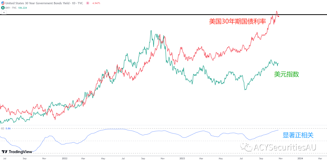 首先自然是每次讲美元都会提到的美国长债利率。自从21年底,美联储讨论紧缩开始,美元与美国长债利率之间便开始呈现明显的正相关性,也就是同涨同跌。尤其从7月份开始,油价大涨令通胀反弹,美国长债利率也随之从盘整转为上行,一路上升至5%的水平。在此期间,线性相关系数也是一路逼近1的最高水平。所以不管是短线还是长线,交易美元首先要看的便是美国长债利率。不过从图中能够发现,自从22年年底开始,美元和美债利率之间出现了巨大缺口,这又怎么解释呢?