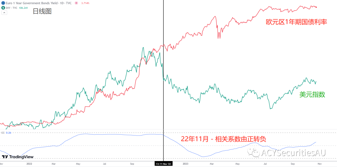 这是因为欧元开始反弹了,作为全球第二大流通量的货币,欧元的涨跌直接影响到美元汇率。而欧元容易受到欧洲短债利率的影响(之所以不是欧洲长债,因为其几乎完全跟随美债影响)。从22年11月开始,欧洲经济逐渐有回暖迹象,央行也开始加息,引发短债利率超越美债上涨。而利率和美元之间的相关系数也直接由正转负,换一句话来说,欧债利率越高,欧元越强,美元便会承压。这就导致了美元和美债利率的分离。