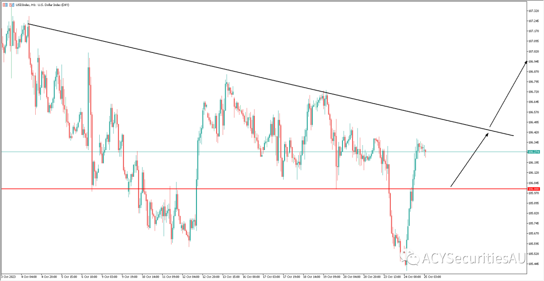 综上上述两方面来看,美元还是处在基本面的上涨阶段。从美元指数一小时图来看,巴以冲突之后,美元的确承受了一定的压力,但基本面仍然强劲,短线交易策略了应该以逢低看涨为主。现价下方的关键支撑无疑是在106整数位大关,该位置同时也是支阻互转水平线位置。在下方则要看105.5前低点附近。上方目标位置现在下降趋势线106.4关口,然后则是107和107.3的高位供给区。