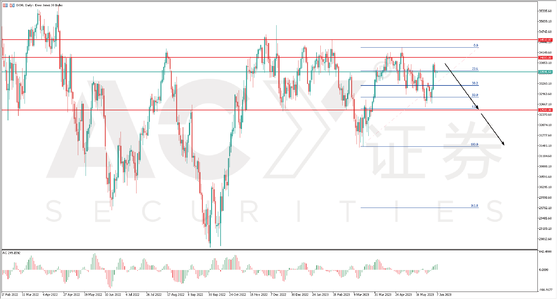 从道琼斯指数日线图来看,指数多次尝试突破34000大关无果,不断受到消息面打压,头部压力已经形成。在K线实体突破34500前高点水平线之前,交易策略以逢高做空为主。现价下方的支撑分别在33200和32500两个斐波那契回调线位置。再下方则要看31500前低点附近。入场时机可以关注AC加速指标下穿零线的空头信号。