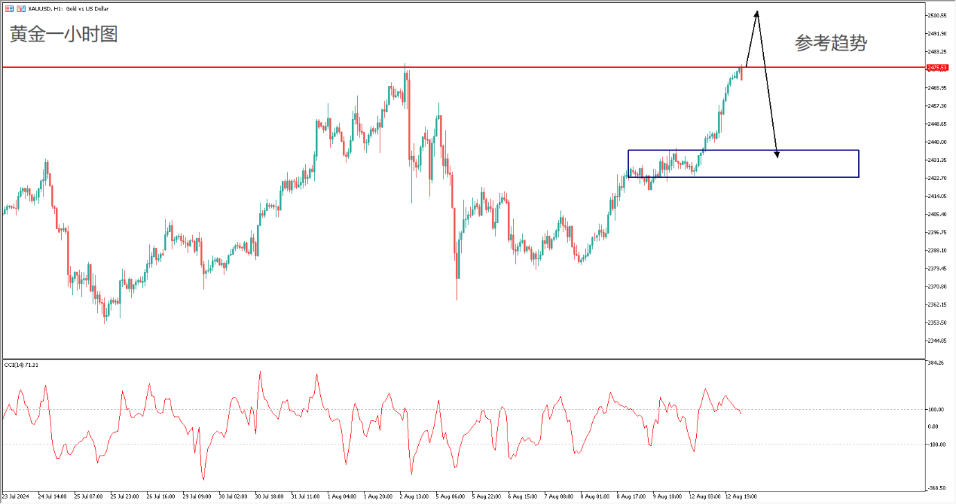 综合来看,黄金与原油价格的看涨动能仍然存在,在没有其他战争消息面之前,应该保持看涨。从黄金一小时图来看,金价抵达历史高点2475关口,日内还是以看涨为主。但突破不代表上涨趋势,因为黄金是最容易做假突破的商品。一旦伊朗打击后宣布袭击结束,那么金价与油价将开始回吐涨幅。怎么涨就怎么跌。日内跟涨可以关注CCI趋势指标向上突破的看涨信号以及回归中心区的平仓信号。