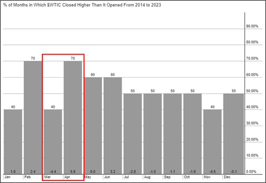 从过去10年的月度报酬率来看,油价在3月有比较明显的下行趋势(4成上涨概率,平均跌幅4.4%),然而若能在3月的相对低点开始布局的话,可以发现4月份往往是一年当中往往有第二大上涨潜力的月份(7成上涨概率,平均涨幅为5.9%)。