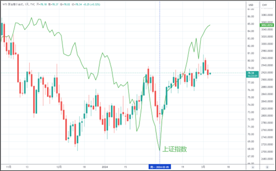 中国上证指数在2月5号下杀至近5年低位,当天一度跌破2700大关,一度被市场人士称为黑色星期一,不过随后市场一股神秘资金出手,最后当天仅小跌做收。后续在中国证监会发声严惩操纵市场恶意做空,并引导券公司通过延长追保时间、动态下调平仓线,保持平仓线弹性,以减少强平风险和市场压力…等种种举措下,上证指数的波段低点与油价在2月份的最低点恰恰都落在2月5号。