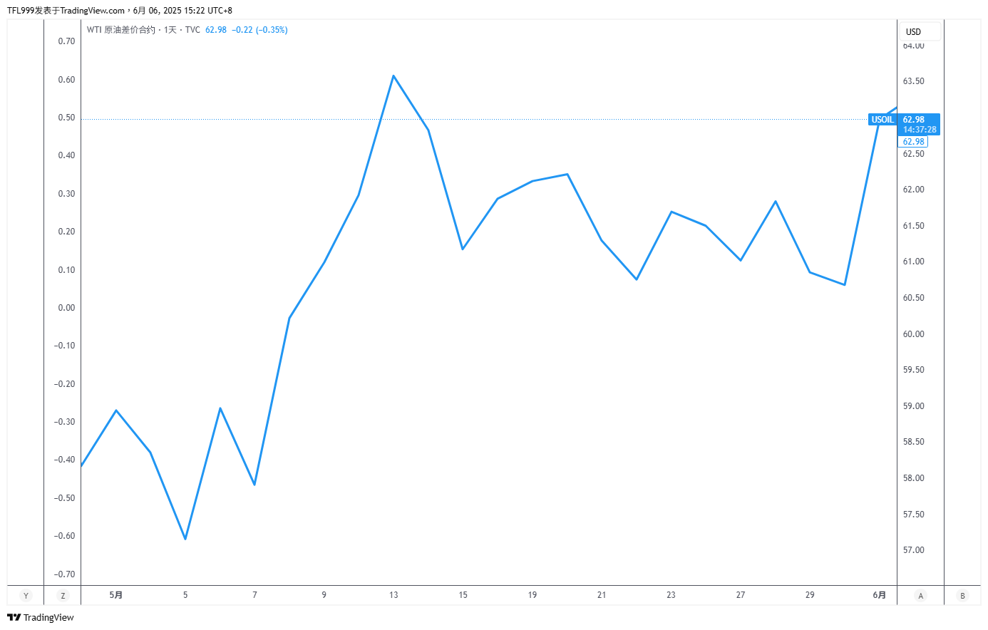 纵观整体5月份的西德州原油价格走势图,属于先下后上,月初时一度下探接近55美元/桶大关,接着向上发力,冲高至月内高点约64美元/桶,过程中经历显著波动,低点到高点的摆荡幅度超过15%。