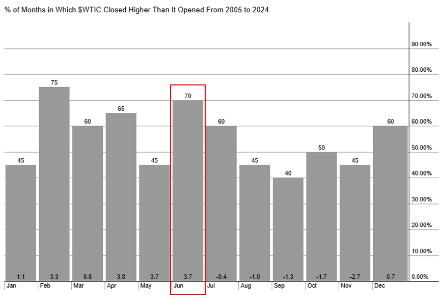 原油的季节性相当明显,以北半球的角度来看,每年的5月底开始到9月中是传统的夏季用油旺季,从下图我们可以发现接下来的6月往往是用油旺季中爆发力最好的月份之一,在过去20年当中,上涨概率为70%,平均上涨幅度高达3.7%,6月份的油价或有机会进一步走高。
