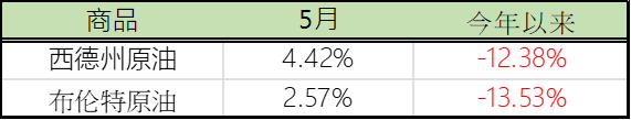 5月原油价格於低档反弹,总算止住4月份的暴跌走势,西德州原油与布伦特原油月线分别收涨4.42%与2.57%。