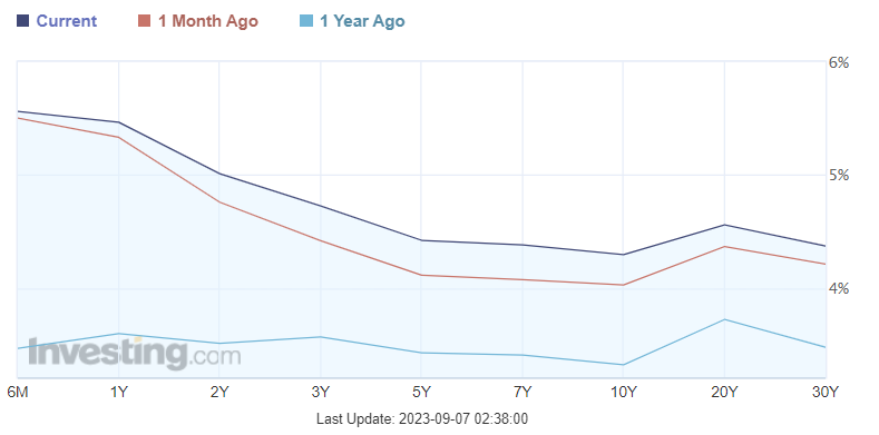 要解释这个问题,我们要引入一个概念——收益率曲线。所谓收益率曲线是指将某个时间点,不同周期的美债利率进行排列,形成的一条曲线。当短债利率上涨速度大于长债利率,就会造成曲线的陡峭(现在是倒挂周期。在正常周期中,应该称为平缓);反之便是平缓(正常是陡峭)。如图所示在过去一年里,短债利率大涨,长债利率小涨,曲线陡峭。之所以要提到曲线,是因为不同资产对不同周期的债券敏感度不同。