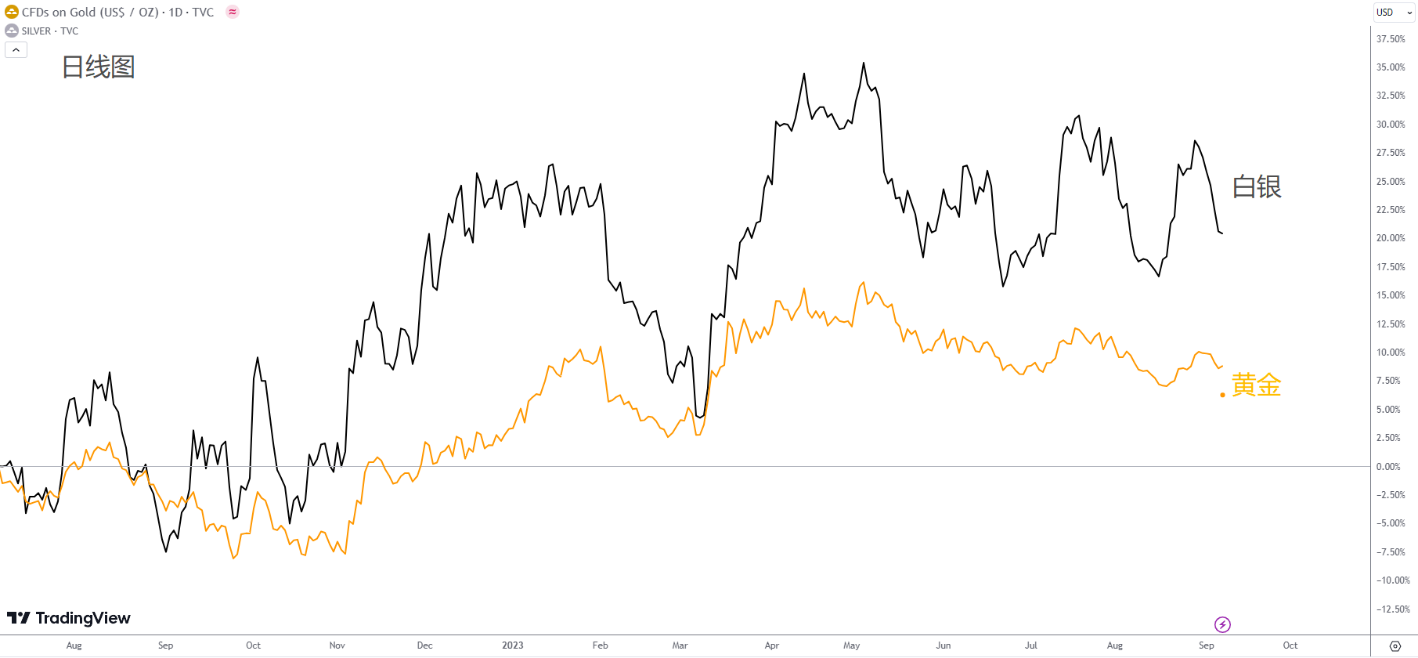 就拿最方便理解的黄金和白银为例。虽然同为贵金属,但属性有一定的差异。相比白银,黄金更容易获得避险需求。因此当经济有衰退风险时,黄金会有更多买家。但反过来说,当衰退风险消退时,黄金便会失去这些避险需求。而当前经济的好坏会直接反映在短债,而非长债上。简单来说,虽然在利率波动时,黄金与白银同涨同跌,白银更容易受到长债影响,而黄金会同时受到短债和长债影响。因此在过去一年曲线陡峭(短债涨跟多)的过程中,黄金的表现是不如白银的。尤其是从22年7月开始(如图),战争的避险需求消退,同时收益率曲线倒挂(短债利率超过长债),白银的表现开始超越黄金。同时这也是从上周五开始,白银跌幅(6%)远超黄金跌幅(1.3%)的原因。在非农发布后,长债利率的上涨远比短债的幅度更大且更加稳定。