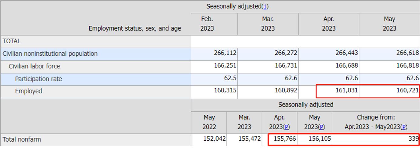 然而非农数据却释放了了相反的信号。对比失业与非农中的就业人口,能够发现明显的差异(不算罕见)。在失业数据中,就业人口总数约16亿,较4月份环比减少了31万人;但在非农数据中,就业人口总数为15.5亿,环比反而新增了34万。数据背离的原因在于不同的数据统计方式,失业率来源于家庭问卷,调查范围更加广泛,包括了农业、自雇以及家庭服务人员等;而非农人口来源于企业工资单,数据收集更加准确,但会忽略一些无薪休假和打多份工的人员。