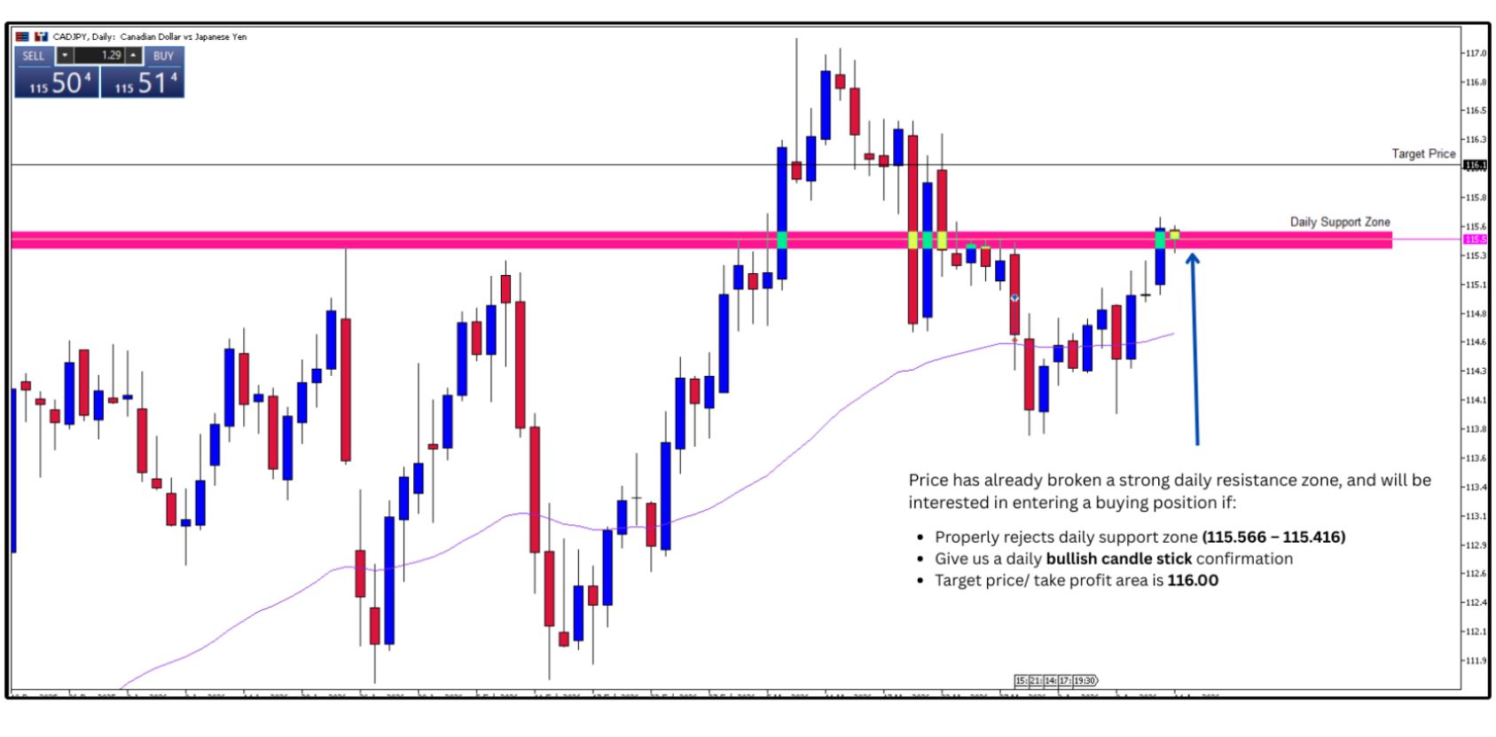 • Price rejects the daily support zone (115.566 – 115.416)