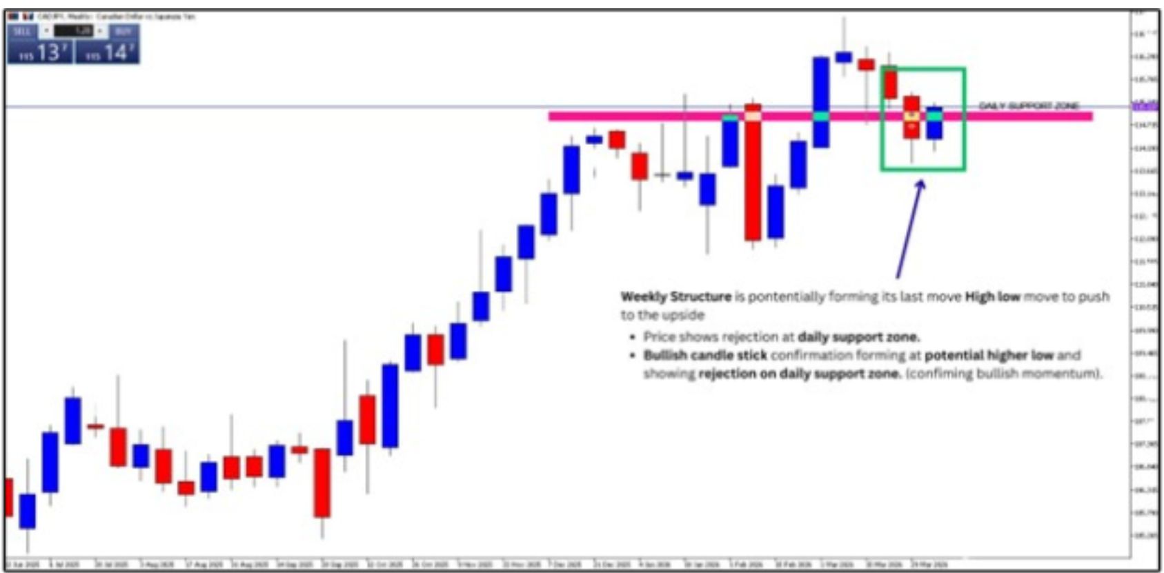 Last week’s CAD/JPY daily chart analysis focused on the broader market structure across both the weekly and daily timeframes. Price action was monitored for a potential higher low at the key support zone (115.017 – 114.800).