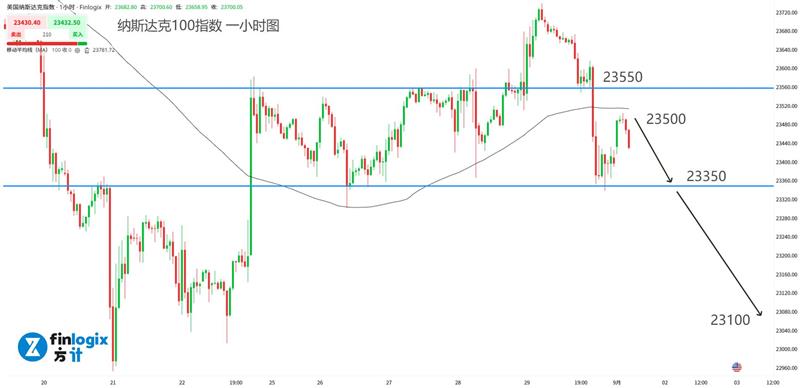技术面:100均线保持水平,价格处在震荡整理期。纳指受到消息面影响跌破23550关口回到震荡趋势,在箱体结构中保持高位做空。一旦跌破箱体下沿,则跟随看跌至前低点23000大关附近。