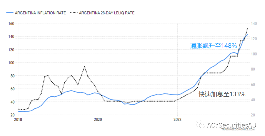 首先要解决的问题就是超级通胀。IMF逼你还钱,怎么办?印钱呗。但印的钱多了,钱就不值钱了。因此阿根廷的通胀从2022年开始飙升,一路涨到了148%。而且由于市场缺乏对政府的信心,因此即便央行已经加息至133%,但想买国债的投资者仍然寥寥无几。再这么下去,通胀可能涨到15000%以上。