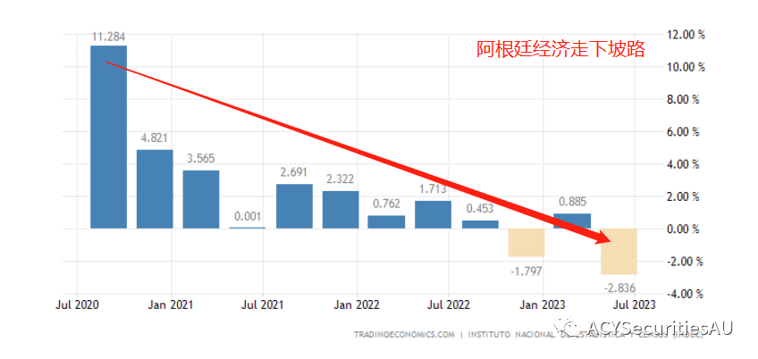 走下坡路。外债缠身、政局动荡、产值下滑,民不聊生、千难万险汇聚成一句话——没钱!没钱那就借呗。2018年,严重的自然灾害令农贸收支恶化,也就在同一年,阿根廷央行与IMF国际货币基金组织签署了总额约570亿美元的救助协议,算是解了燃眉之急。然而在借完钱后,阿根廷非但没有节衣缩食,反而照样大手大脚。不一会就把钱给花光了,但经济却不见回暖的迹象。