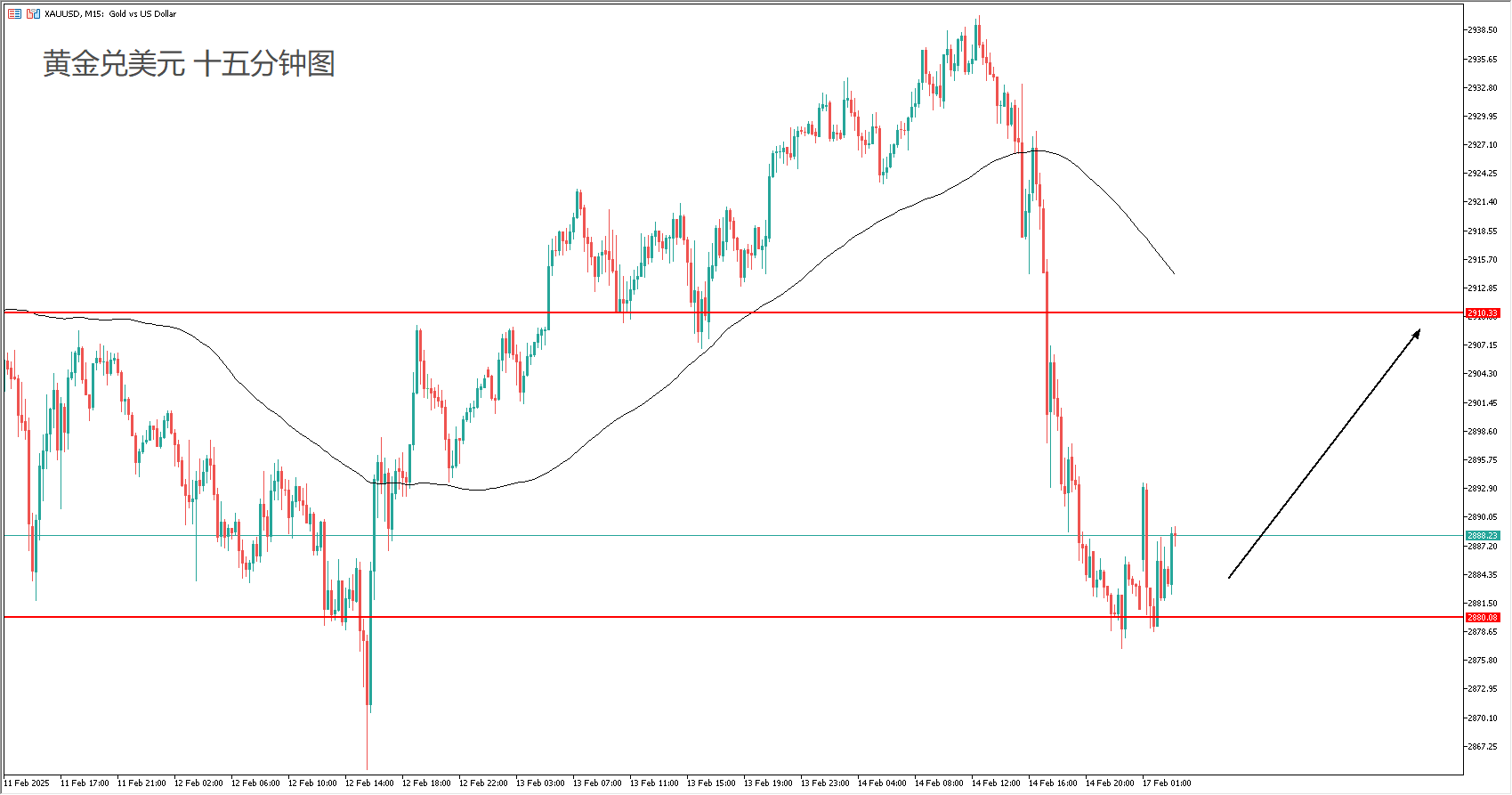 技术面:100均线向下,消息面动能强劲,需要关注能否突破关键支撑。2880是头部颈线关键支撑,在没有突破之前,保持日内逢低看涨的趋势。