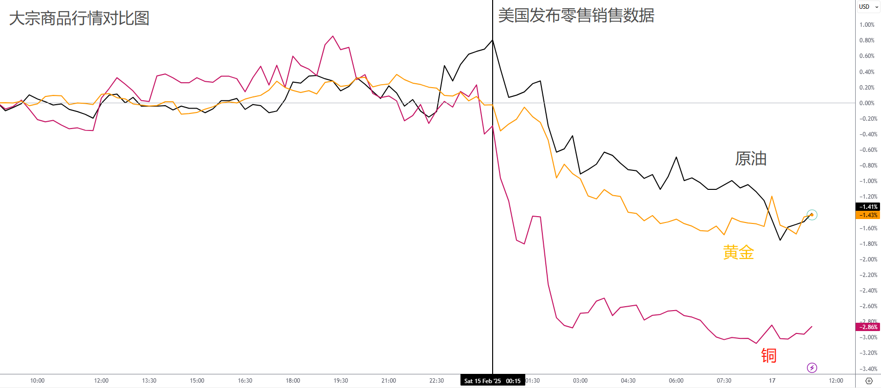 上周五最有意思的行情发生在大宗商品市场,拐点是美国远低于预期的零售销售数据。受到美国暴风雪和严重火灾影响,零售销售月率报得-0.9%,预期-0.1%,前值0.7%。