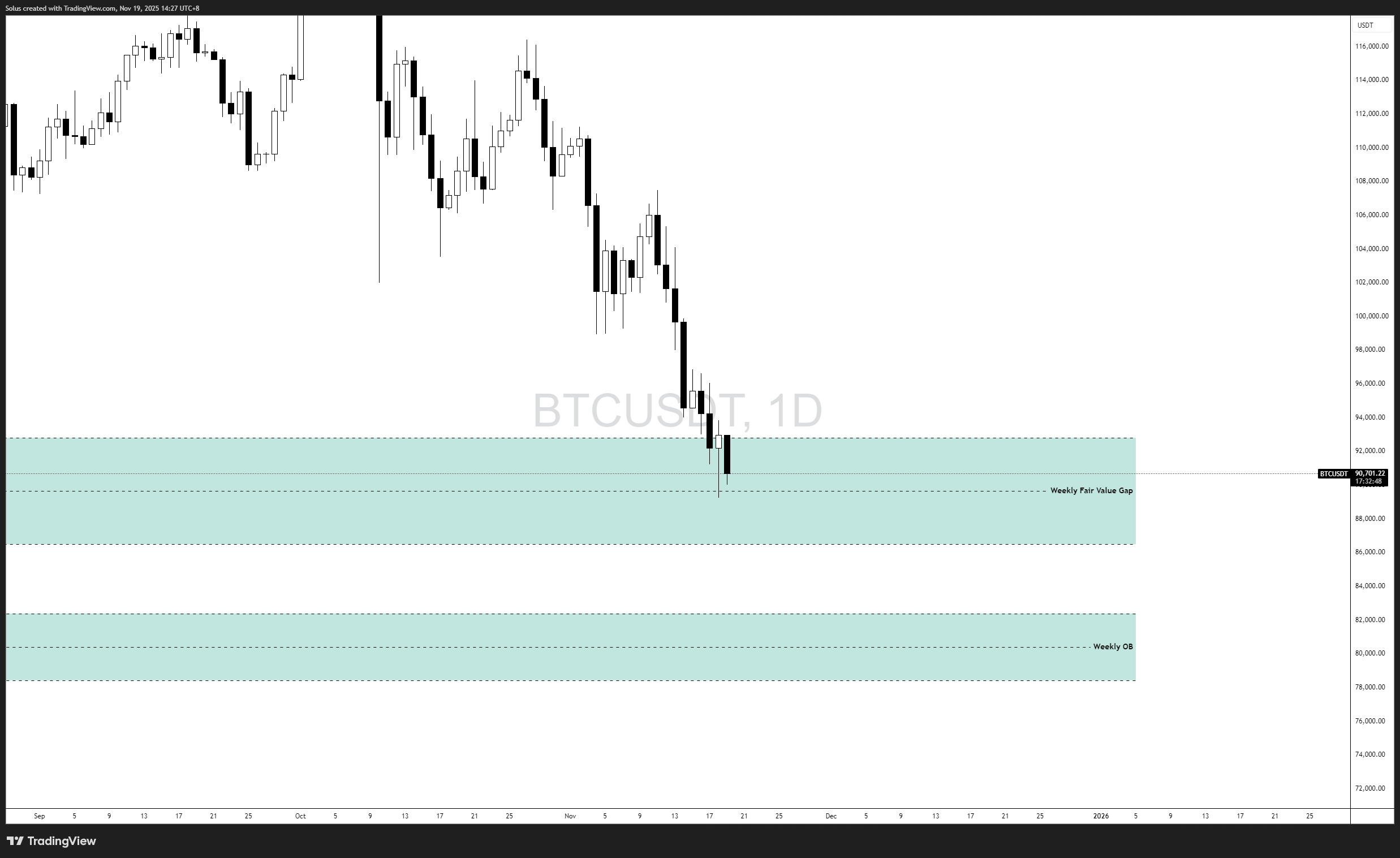 Bitcoin is now trading inside a large Weekly Fair Value Gap between 92,000 and 86,500 — an area where the market should attempt to react if buyers want to stop the bleeding.