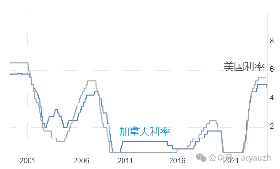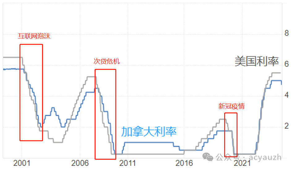 这自然不是空穴来风。自2000年量化宽松时代开始,利率成为经济活动的主要驱动,美国和加拿大的利率走势变得极为相似。可以说,在过去20年里,美加利率始终同涨同跌。而且每当美国开始降息,加拿大都会立即跟着降息。