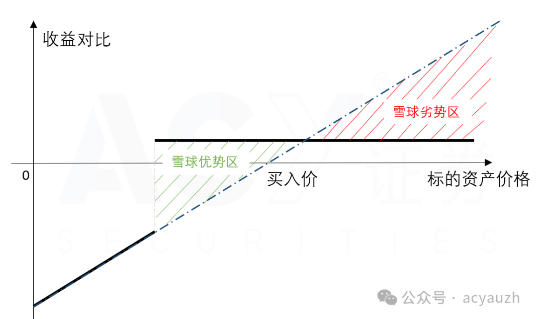 由图可见,和卖出做空期权一样,雪球产品也是牺牲上行收益,来提高整体盈利的。只不过,卖出做空期权的收益是期权费,而雪球的收益是按照资产百分比,收益远超期权费,但无法减少下行亏损。