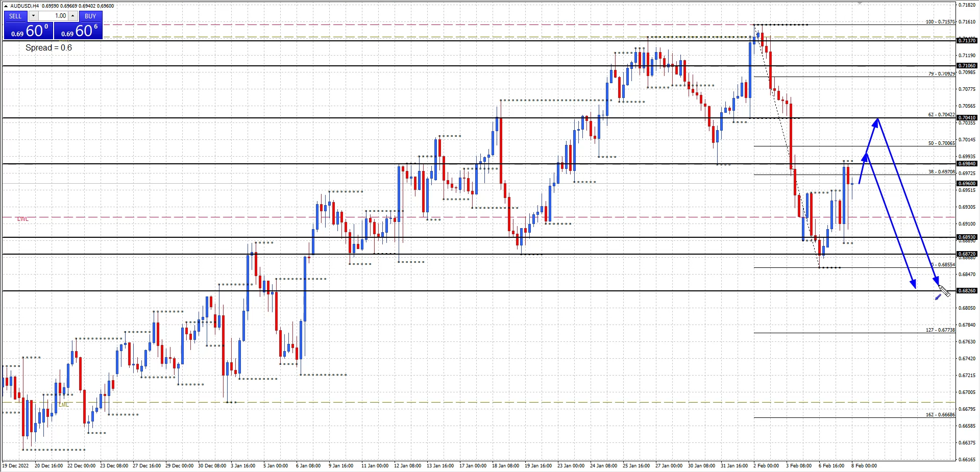 Watching for price to rally and fail at an intraday resistance level for a further decline targeting the 0.6826 monthly support level.
