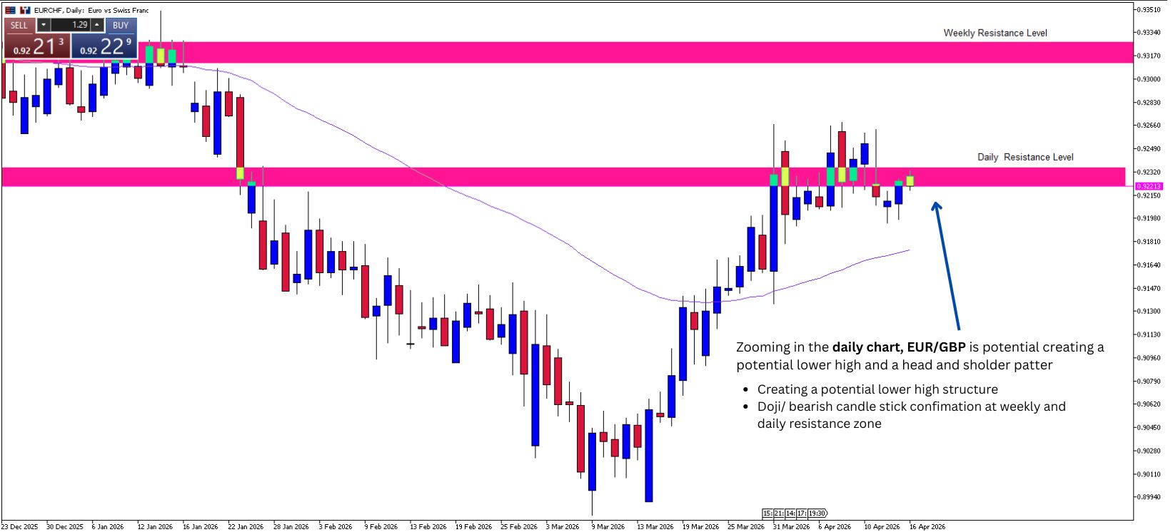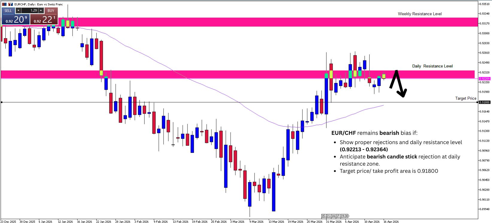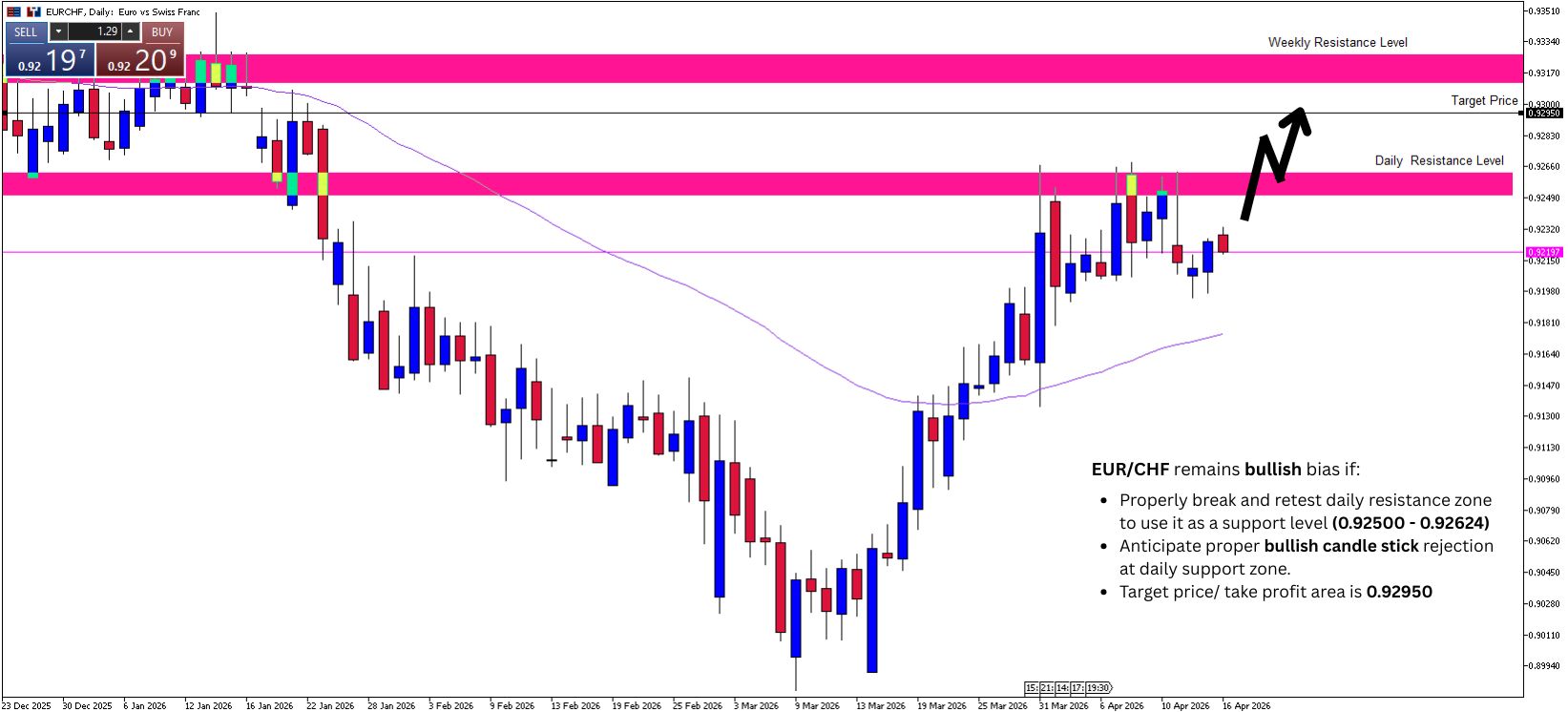On the daily chart, EUR/CHF is retesting the 0.92213 - 0.92364 resistance zone, a level that has already shown strength.