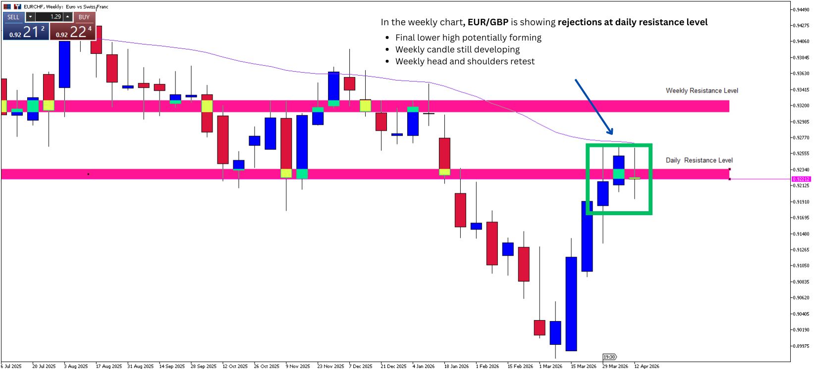 In the weekly chart, we could be seeing that final lower high structure forms before a push lower and at the same time, price is retesting a clean head and shoulders pattern with 50 ema indicator confluence, this give us a story that buyers aren’t showing strong conviction.