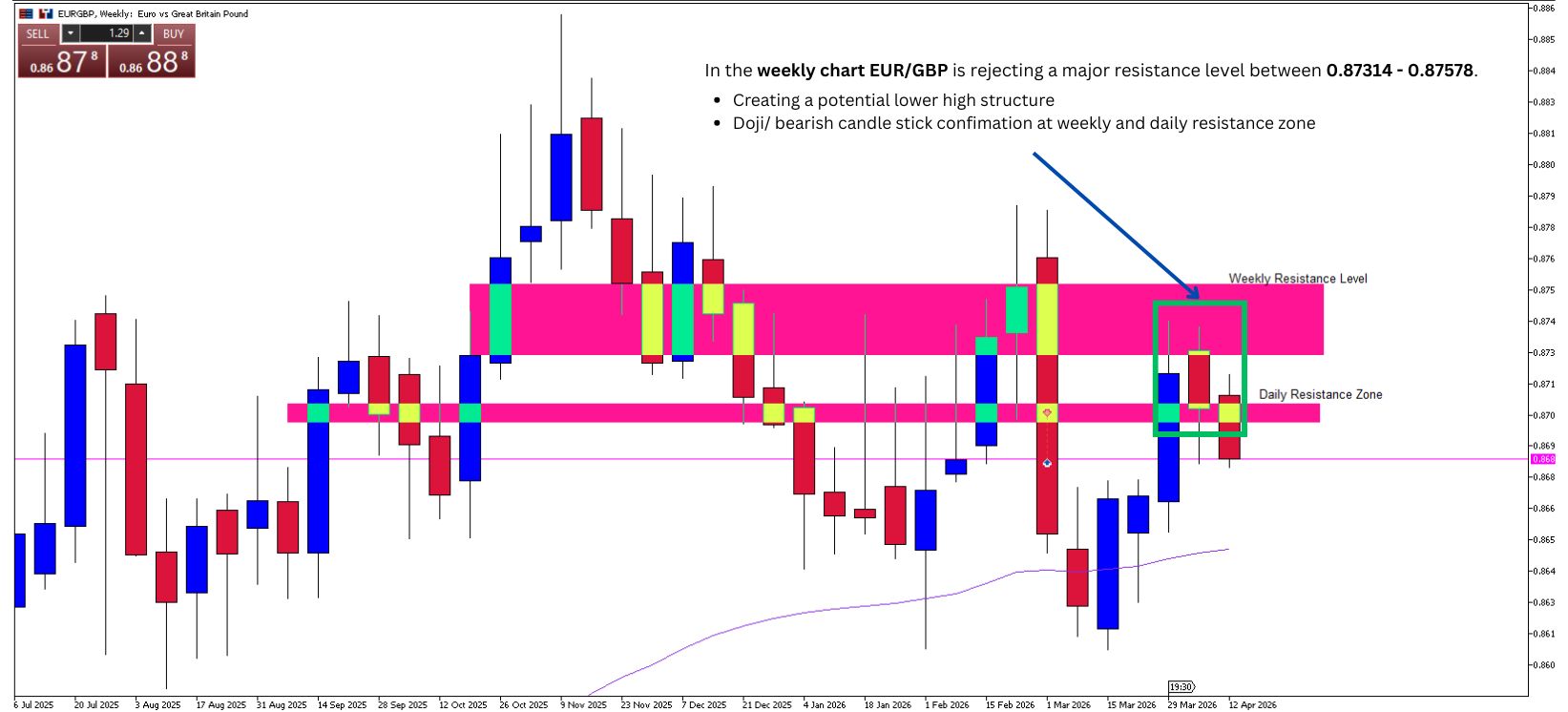 On the weekly chart, EUR/GBP is rejecting a major resistance level between 0.87314 and 0.87578. This rejection is actively creating a potential lower high structure. This specific setup strongly indicates a massive push to the downside is coming soon.