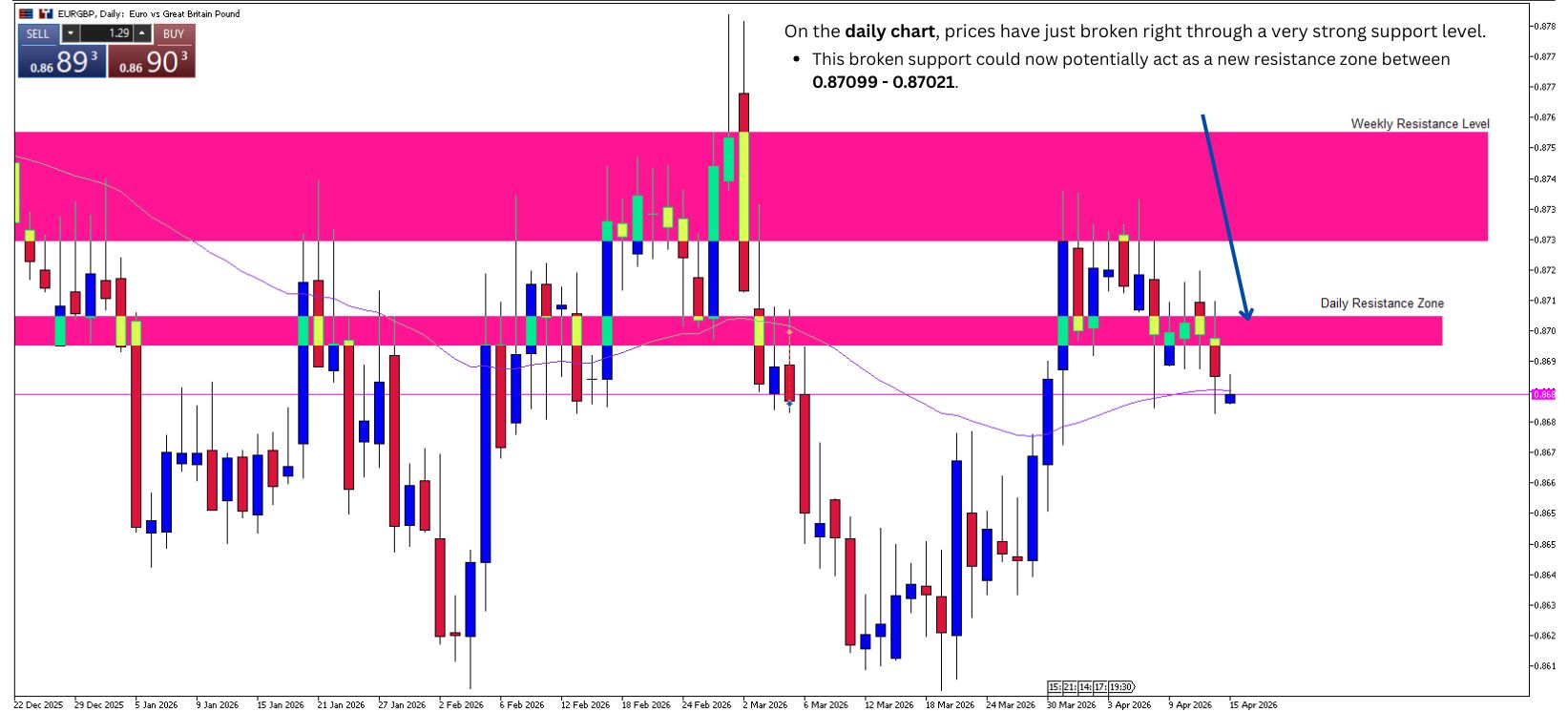 Zooming in on the daily chart, prices have just broken right through a very strong support level. This broken support could now potentially act as a new resistance zone between 0.87099 - 0.87021