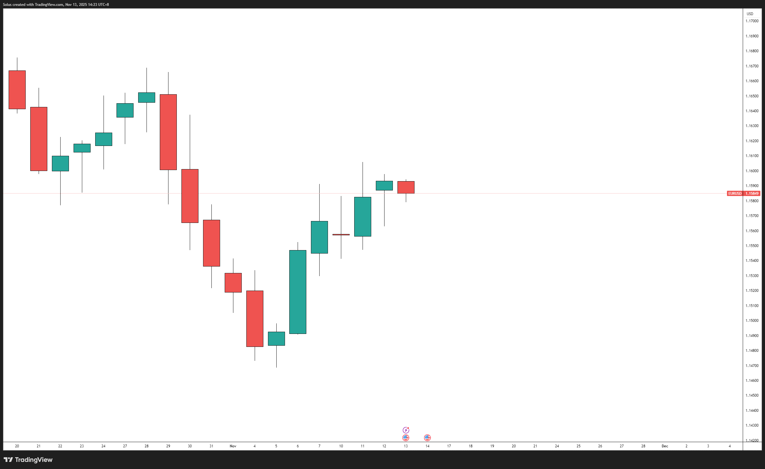 The broader structure shows that EURUSD has climbed from earlier November lows, but buyers are now waiting for confirmation before attempting to break above the 1.16059 ceiling.